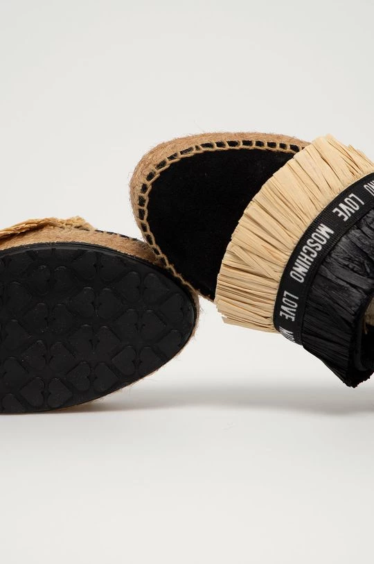 Εσπαντρίγιες από τη συλλογή Love Moschino. Μοντέλο από συνδυασμό δέρματος σαμουά και υφασμένου υφάσματος.